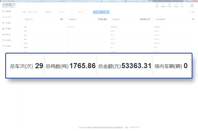 對(duì)過磅類型、特點(diǎn)時(shí)間段或全部時(shí)間段的車次、噸數(shù)、金額等進(jìn)行匯總,并可以直接導(dǎo)出報(bào)表;