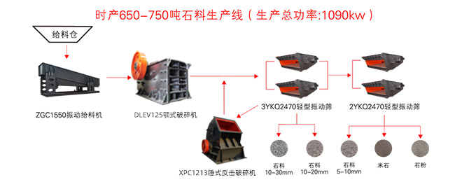 以常見的時產700左右顎式破碎機石料生產線配置舉例,工藝流程如上圖所示,大塊物料經料倉連續(xù)、均勻的輸送到DLEV125顎式破碎機中進行初級破碎,破碎后的一部分物料直接進入篩分環(huán)節(jié),一部分物料輸送到XPC1213錘式反擊破碎機中細碎整形,而后進入篩分環(huán)節(jié),篩分出來不符合成品料粒度要求的被返料帶返回二級破碎機再次加工,形成一個閉路循環(huán),設備配置可以根據項目實際需求靈活配置。