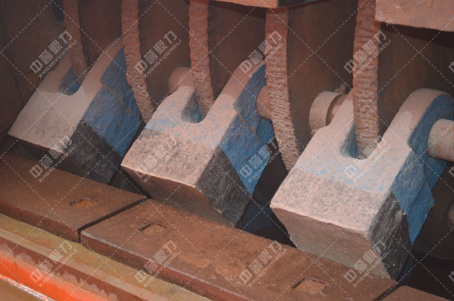 2、在不可破異物通過破碎腔或因某種原因機器載時,錘式破碎機彈簧保險系統(tǒng)實現(xiàn)保險,排礦石增大。異物從機腔排出,如異物卡在排礦口使用清腔系統(tǒng),使排礦繼續(xù)增大,使異物排出破碎腔。錘式破碎機在彈簧的作用下,排礦口自動復(fù)位,設(shè)備恢復(fù)正常工作;