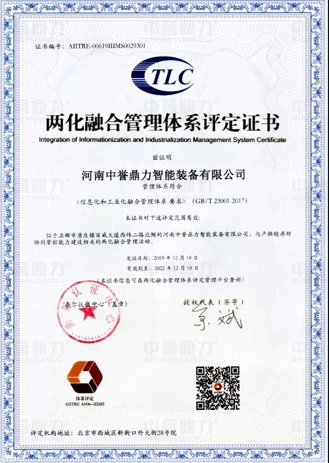 日前,河南中譽(yù)鼎力智能裝備有限公司正式通過兩化融合管理體系貫標(biāo)認(rèn)證,取得工信部的評定機(jī)構(gòu)頒發(fā)的“兩化融合管理體系評定證書”。