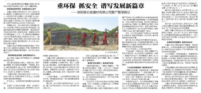 4月底,湖北日報刊文《重環(huán)保 抓安 譜寫發(fā)展新篇章——崇陽縣石鑫建材有限公司復(fù)產(chǎn)復(fù)綠側(cè)記》和湖北電視臺報道《復(fù)工復(fù)產(chǎn)復(fù)綠做表率 崇陽縣石鑫建材再起航》,對中譽鼎力承建咸陽市石鑫建材環(huán)保智能砂石骨料生產(chǎn)線復(fù)工、復(fù)產(chǎn)、復(fù)綠情況進(jìn)行了方位宣傳。