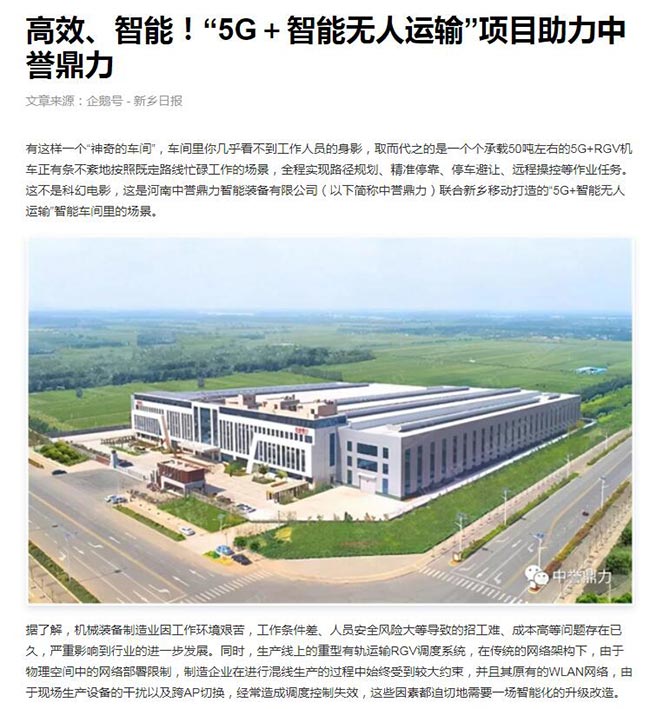 《、智能!“5G+智能無人運輸”項目助力中譽鼎力!》,12月15 日,《新鄉(xiāng)日報》報道公司積打造智能化車間,利用智能管理調(diào)度系統(tǒng)實現(xiàn)遠(yuǎn)程實時控制,為中譽鼎力將5G”從理論到應(yīng)用”做出良好的行為點贊。