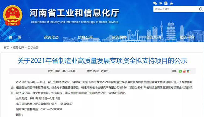 2020年12月28日—30日,河南省工業(yè)和信息化廳、省財(cái)政廳聯(lián)合組織對(duì)2021年省制造業(yè)高質(zhì)量發(fā)展專(zhuān)項(xiàng)資金疑似重復(fù)支持項(xiàng)目組織召開(kāi)了答疑會(huì),536個(gè)項(xiàng)目為2021年省制造業(yè)高質(zhì)量發(fā)展專(zhuān)項(xiàng)資金擬支持項(xiàng)目。