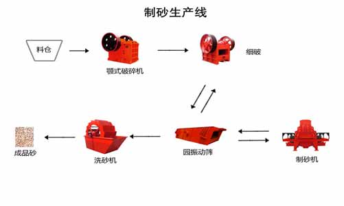 一般制砂生產(chǎn)線由破碎制砂設(shè)備和輔助設(shè)備共同構(gòu)成,其中破碎制砂設(shè)備根據(jù)流程依次為:顎式破碎機(jī)(粗破)、圓錐式破碎機(jī)/反擊式破碎機(jī)(細(xì)破)、制砂機(jī) ,分三個(gè)破碎等級(jí)對(duì)物料進(jìn)行加工處理。輔助設(shè)備一般有:給料倉、振動(dòng)給料機(jī)、傳輸皮帶機(jī)、振動(dòng)篩、洗砂機(jī)。