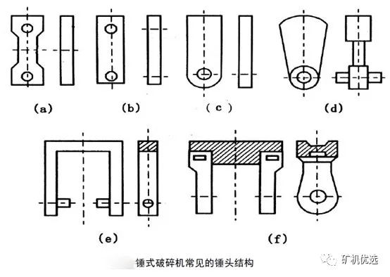 上圖中(a)、(b)、(c)是輕型錘頭,質(zhì)量通常為3.5~15.0kg,多用于破碎塊度為100~200mm的軟質(zhì)和中硬物料。其中(a)、(b)兩種是兩端帶孔的,磨損后可以調(diào)換4次;而(c)種錘頭只能換2次。(d)為中型錘頭,質(zhì)量為30~60kg,且距懸掛較遠(yuǎn),多用于破碎800~1000mm的中硬物料;而(e)、(f)是重型錘頭,其質(zhì)量為50~120kg,主要用來破碎大塊且堅硬的物料。