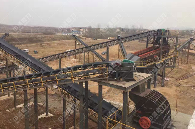 【工藝流程】:原料經(jīng)料倉(cāng)由倉(cāng)外給料機(jī)送到錘式破碎機(jī)初步破碎,破碎后的物料被輸送到一組并篩進(jìn)行篩分,成品料直接送到成品料堆,不滿足成品料粒度要求的,被返回整形破碎機(jī)進(jìn)行再次加工破碎。