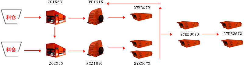 從山上爆破下來(lái)的石灰石石料,通過自卸車將1200mm以下的石料送入振動(dòng)給料機(jī),振動(dòng)給料機(jī)把石料均勻的送入重錘式破碎機(jī),重錘破對(duì)石料進(jìn)行段破碎,從重錘破出來(lái)的大塊物料再送入下段錘破進(jìn)行二次破碎整形。通過圓振動(dòng)篩分級(jí)篩分后,粒度不合要求的大塊物料通過輸送帶回到二段錘破重新破碎,成品由皮帶輸送機(jī)輸送至成品區(qū)。 石灰石抗壓強(qiáng)度一般在150兆帕左右,屬于軟巖,因此石灰石生產(chǎn)線的生產(chǎn)工藝選擇上,采用兩臺(tái)重型錘式破碎機(jī)組成的兩段一閉路工藝是一種既經(jīng)濟(jì)又合理的選擇。