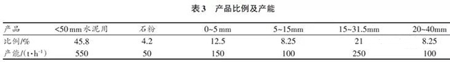 利用自有石灰石礦用配套投建年產(chǎn)百萬噸碎石生產(chǎn)線采取的重錘式破碎機(jī)+整形錘式破碎機(jī),在不思考單獨(dú)制砂的情景下,產(chǎn)品份額及處理量見表3。